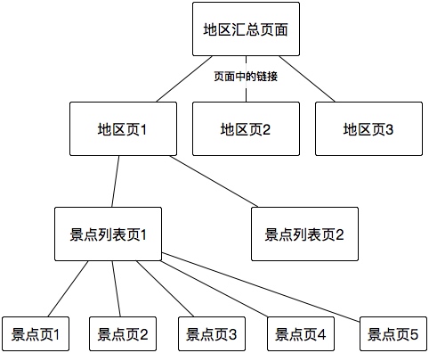首先我找到了地区的汇总页面,这个汇总页面中有很多地区页的链接,我们要识别出来这些链接,并加入待抓取队列,然后如果抓到了地区页面,要在这个页面中找到这个地区的景点列表页;然后如果抓到了景点列表页,从这个页面我们要找到景点页的链接,并且还有景点列表页的不同页数的链接;最后才是我们需要的景点页,可以对其进行解析或者直接把页面保存下来。前面的所有链接都是帮助找到景点页的帮助页面,而景点页才是真正的目标页面。