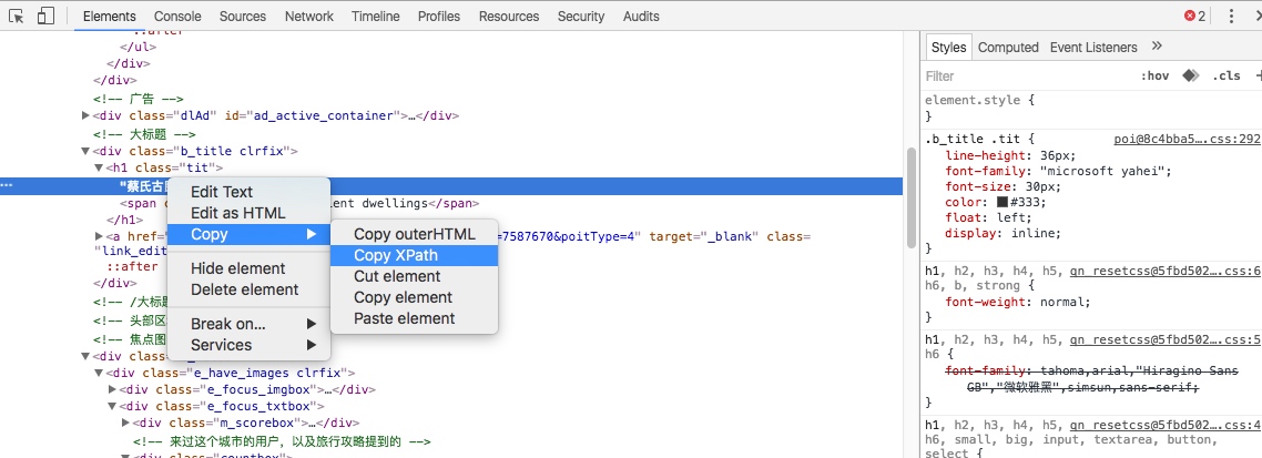 如果用XPath进行元素的选取,可以利用Chrome浏览器的审查元素中的Copy Xpath这个功能。